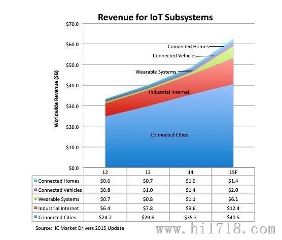 物聯(lián)網(wǎng)是新一代信息技術(shù)的重要組成部分,也是信息化時代的重要發(fā)展階段,被稱之為繼計算機、互聯(lián)網(wǎng)之后世界信息產(chǎn)業(yè)發(fā)展的第三次浪潮。IC Insights將物聯(lián)網(wǎng)市場分為連網(wǎng)汽車、連網(wǎng)家庭、工業(yè)因特網(wǎng)、連網(wǎng)城市以及可穿戴設(shè)備等五大應(yīng)用領(lǐng)域,該機構(gòu)認為其中以可穿戴設(shè)備的成長動力最強勁。