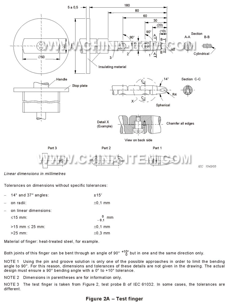 試驗(yàn)直指是滿足IEC61032圖7試具11、GB/T16842試具11、GB8898、IEC60065、IEC60598、GB7000、IEC60335、GB4706等標(biāo)準(zhǔn)要求,尺寸與IEC61032試具B相同,不帶關(guān)節(jié),在測試中用于模擬手指,主要用于施加外力的情況下手指防止接近危險(xiǎn)部件測試。